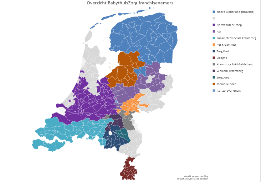 BabythuisZorg is al in 80% van de gemeenten in Nederland beschikbaar en we streven naar 100% dekking in Nederland. BabythuisZorg wordt aangeboden door verschillende franchisenemers.